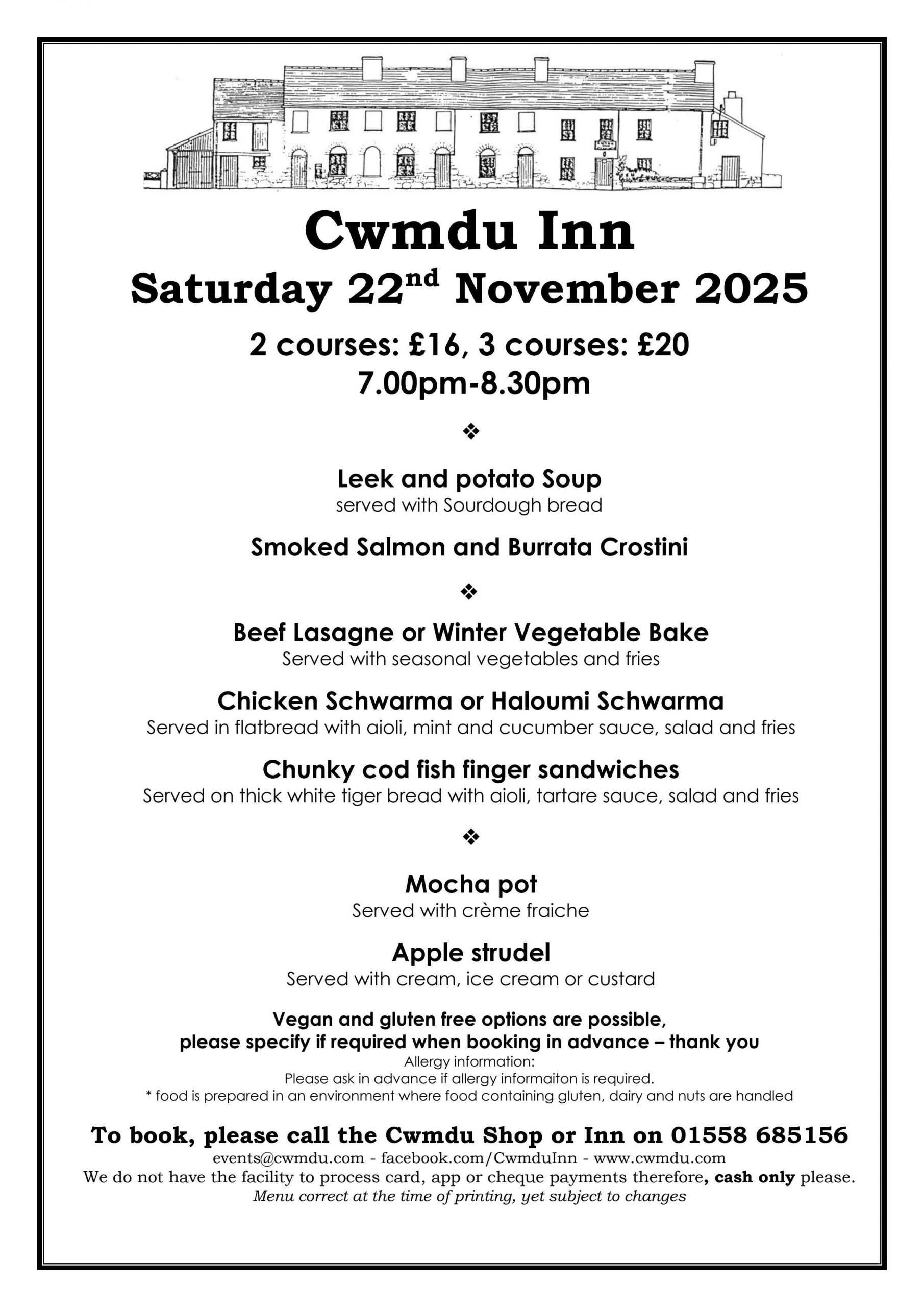 Saturday 22nd November Tanya's menu for Cwmdu Inn . To book please call the shop or pub during opening hours on 01558 685156 Bar open 7 - 11pm.