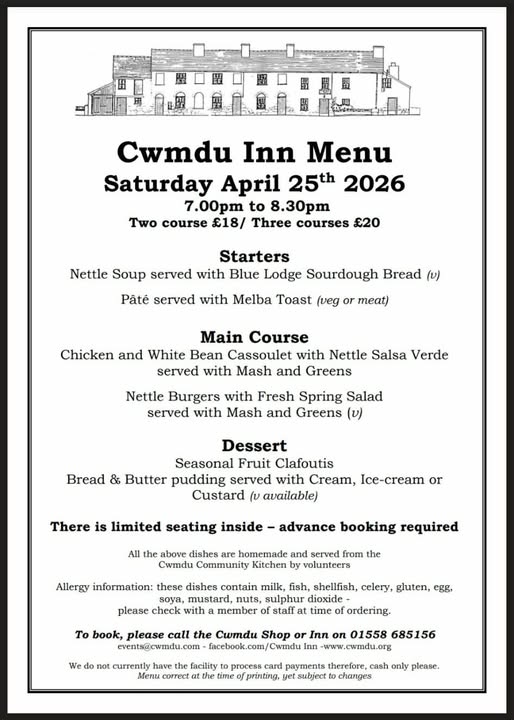 Saturday 25th April Tanya has grasped the nettle and cooked up a fabulous menu. To book please call the shop or pub during opening hours on 01558 685156