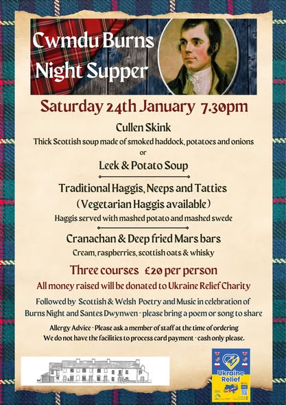 If you are not able to make our celebration of Robbie Burns at Cwmdu Inn you might like to prepare your own. Some hints on this and more information you could visit the RobertBurns.org web site.