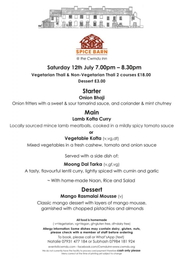 All meals are homemade where possible. Cooked and served from the Cwmdu Community Kitchen by the Spice Barn team