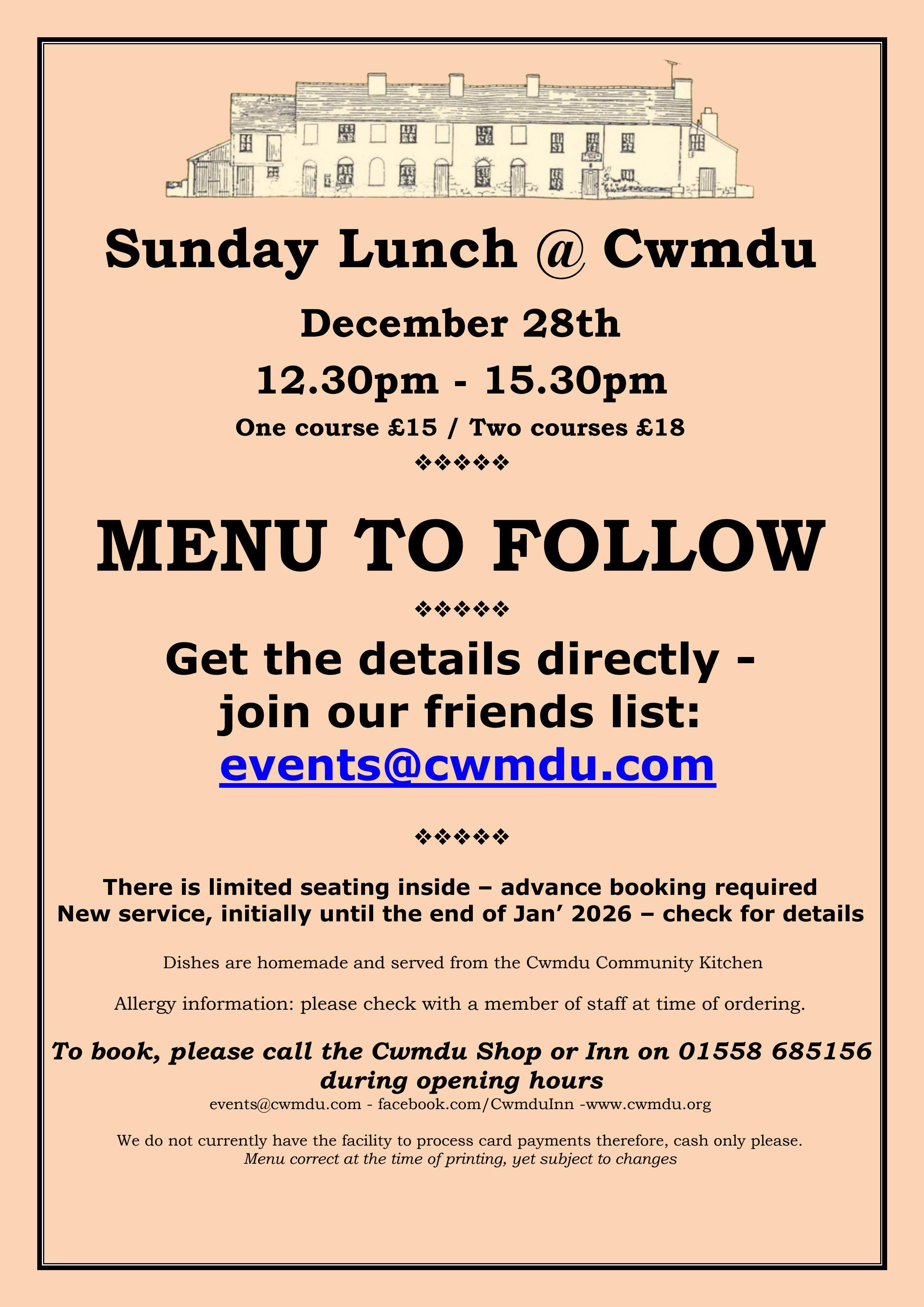 **Sunday Lunch ** 28th December @ Cwmdu Inn . 12:30 - 15:30 pm To book please call the shop or pub during opening hours on 01558 685156 Bar open 12:30pm.