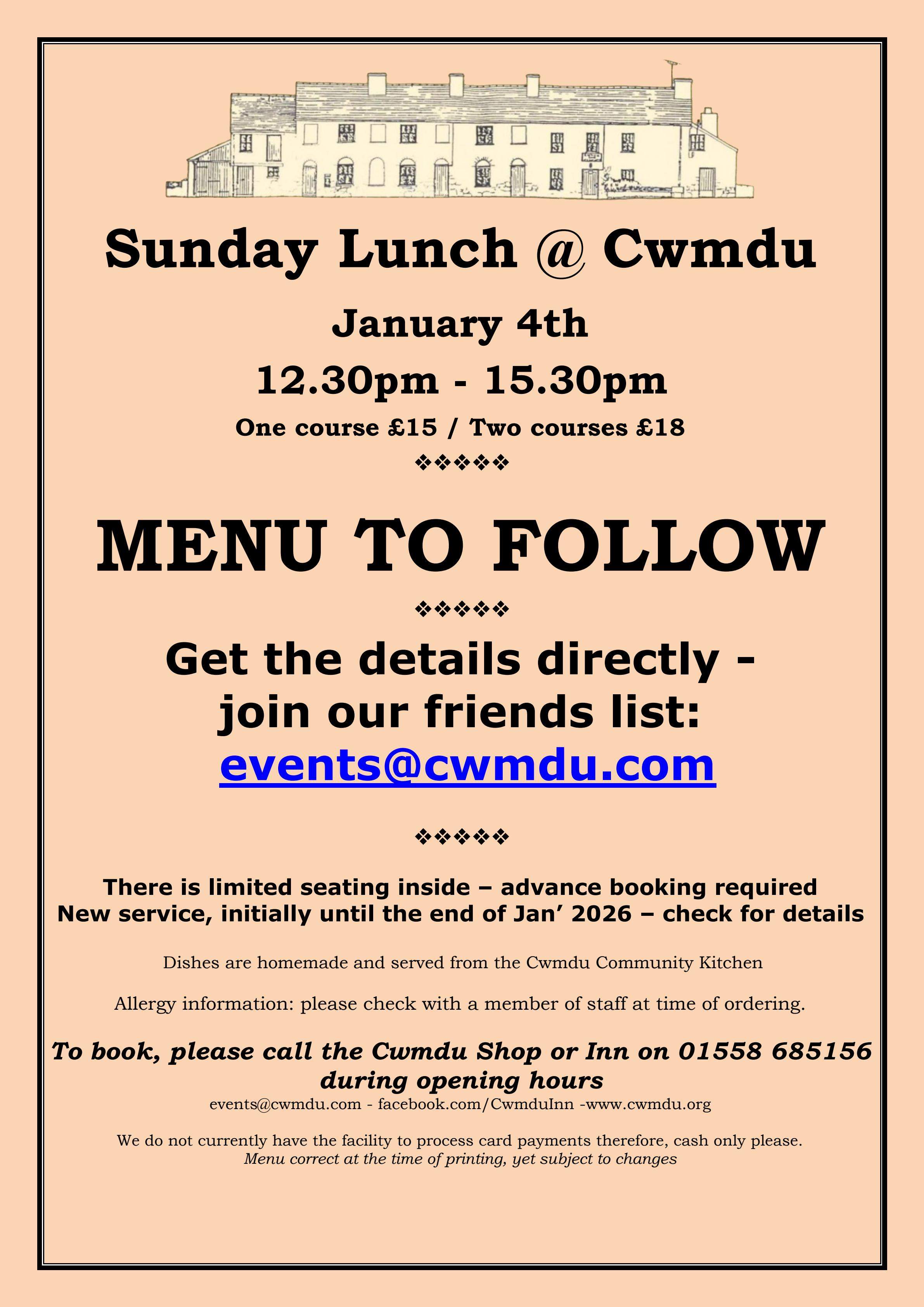 **Sunday Lunch ** 4th January @ Cwmdu Inn . 12:30 - 15:30 pm To book please call the shop or pub during opening hours on 01558 685156 Bar open 12:30pm.