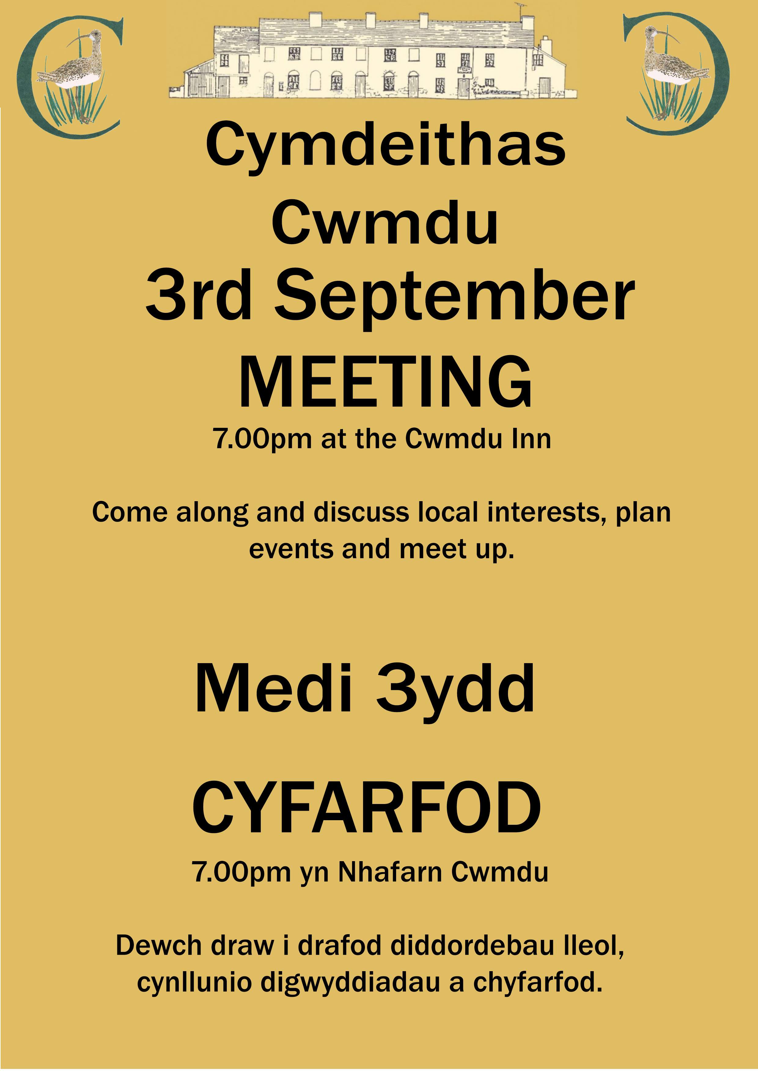 260903-Cymdeithas Cymdeithas Cwmdu Meeting Usually the 1st Thursday of the month, . Discuss local issues, plan events and meet your friends.